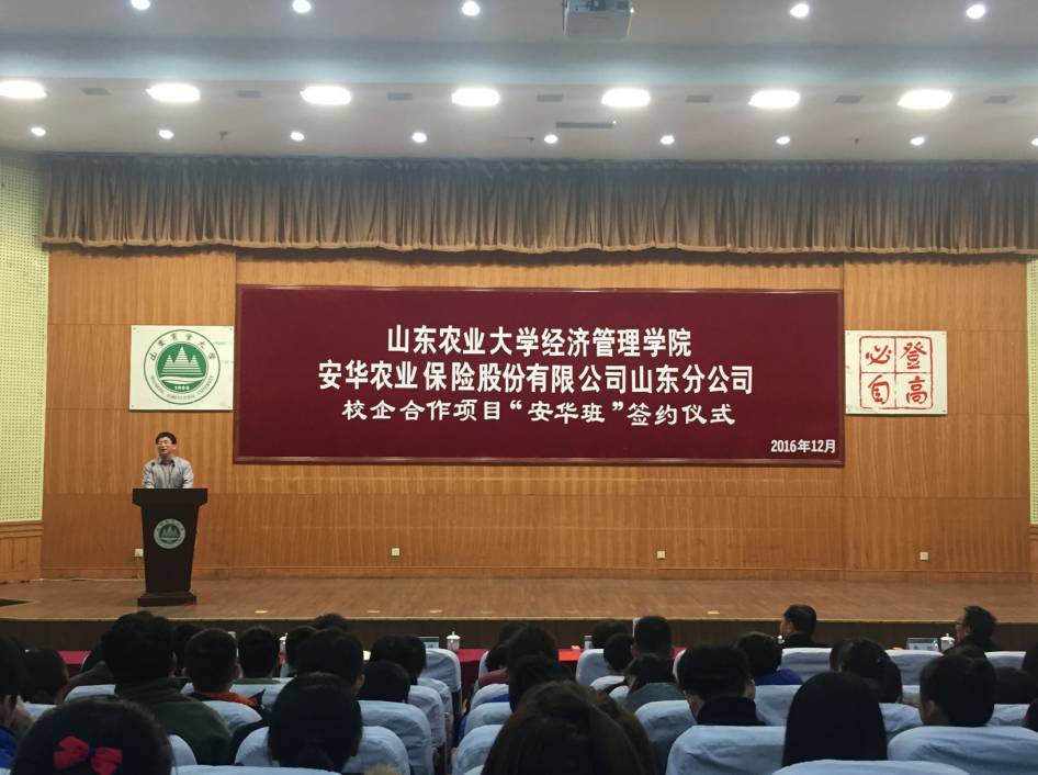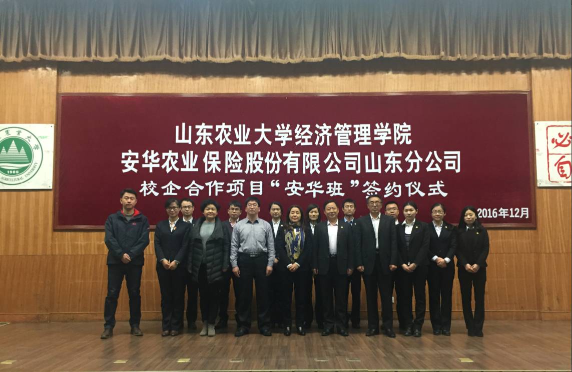 12月18日,经管学院与安华农业保险公司山东分公司举行签约仪式,正式成立“安华班”。学院院长陈盛伟与分公司总经理张丽华在协议书上签字,党委副书记齐清及部分团委老师参加签约仪式。