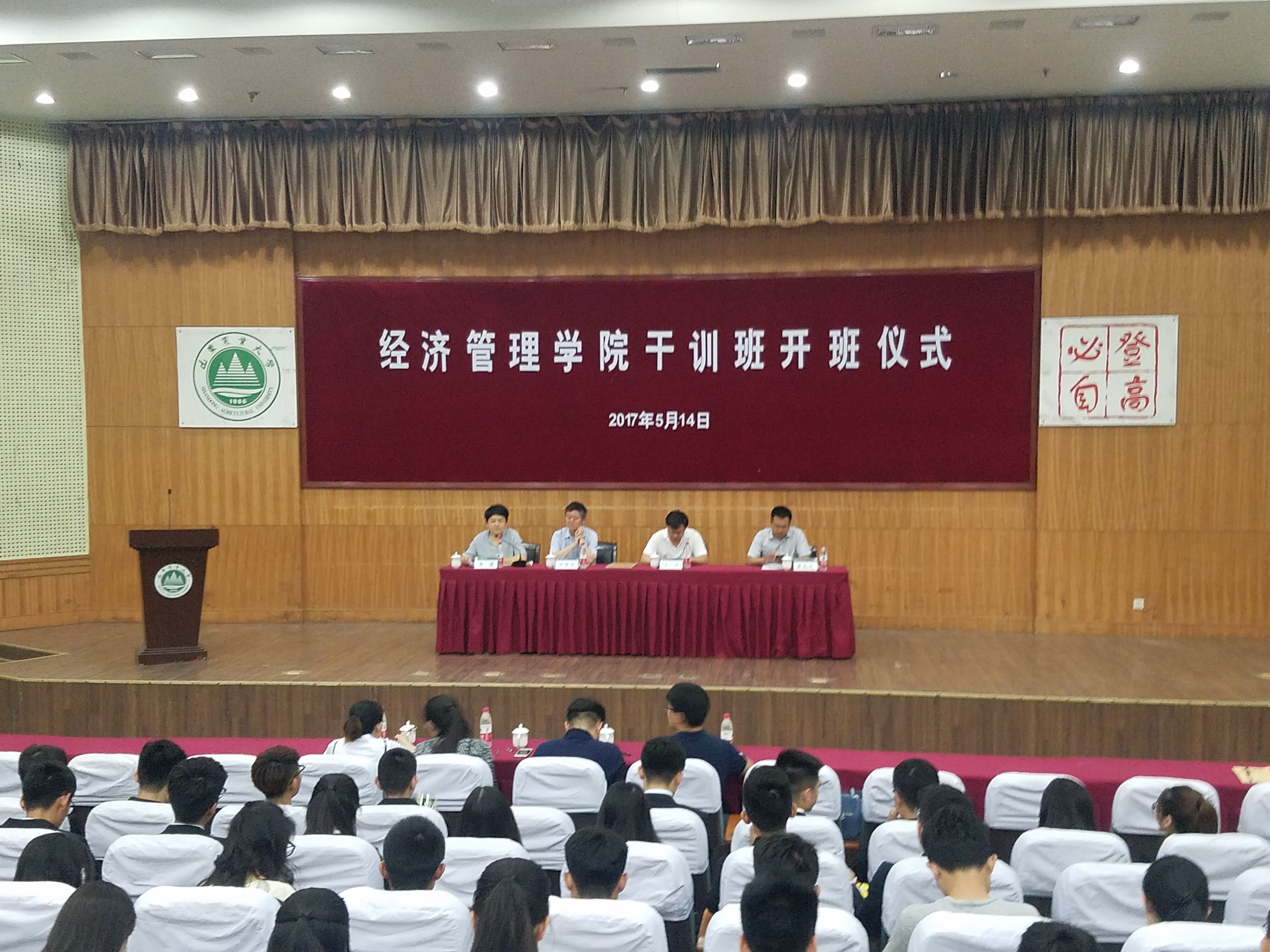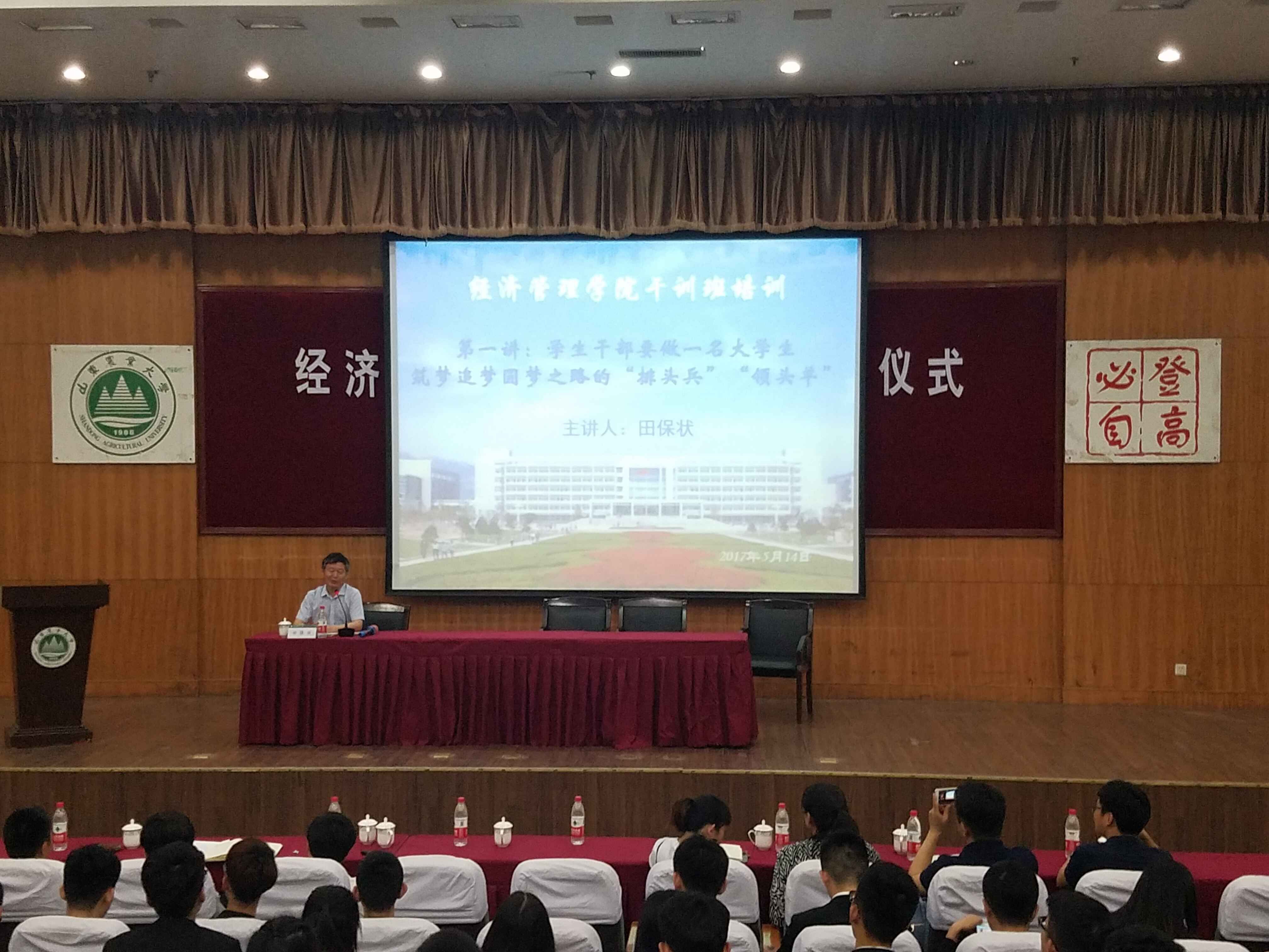 5月14日,经管学院2017年“干训班”开班仪式在南校区第一学术报告厅举办,学校离退休处处长田保状、学校团委副书记王利、经管学院党委副书记齐清、经管学院全体辅导员老师及400余名学生干部参加启动仪式,仪式结束后,田保状为“干训班”作了首场培训。