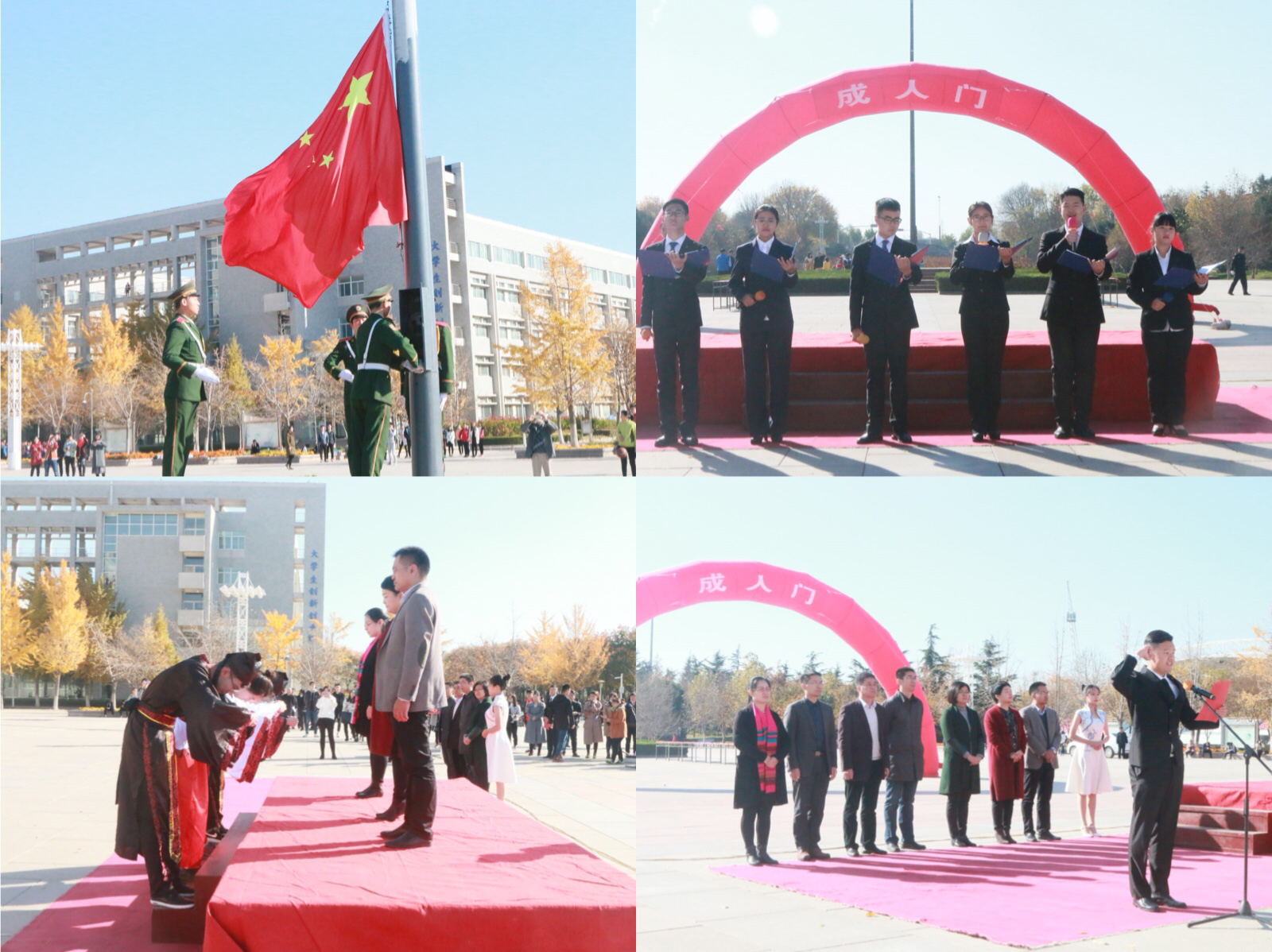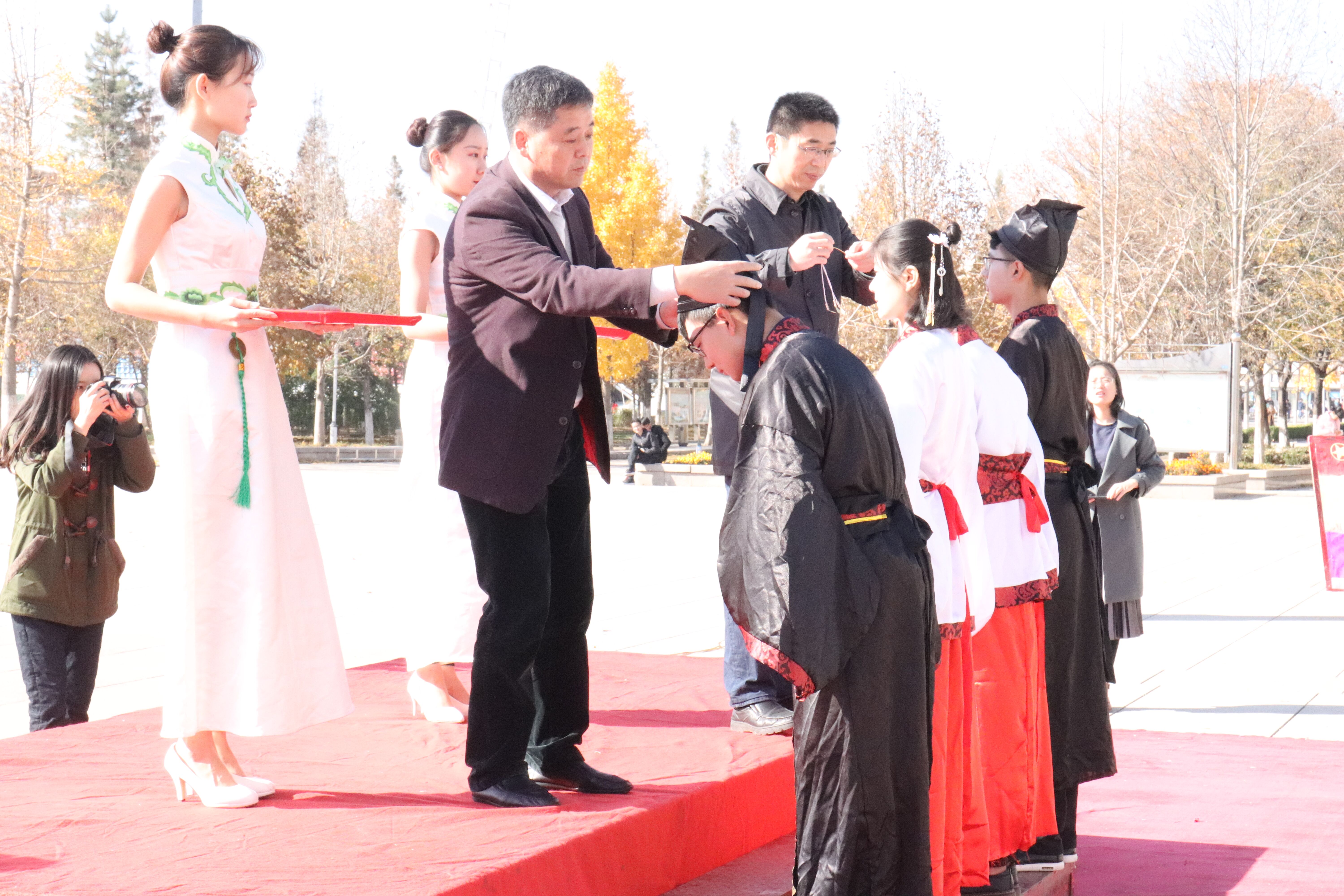 2017级学生代表身着汉服,接受魏立政等师长的加冠加钗,行正规拜礼,聆听师长教诲。新生代表的朗诵《岱下青春》表达了同学们积极向上,努力奋斗的心声。王群老师劝勉同学们要用信念导航人生,用执着追求梦想,用双肩扛起自己的未来。全体同学集体宣誓,穿过成人门,在横幅上郑重地签上了自己的名字,将告别天真,以无限的激情步入成年的新阶段。