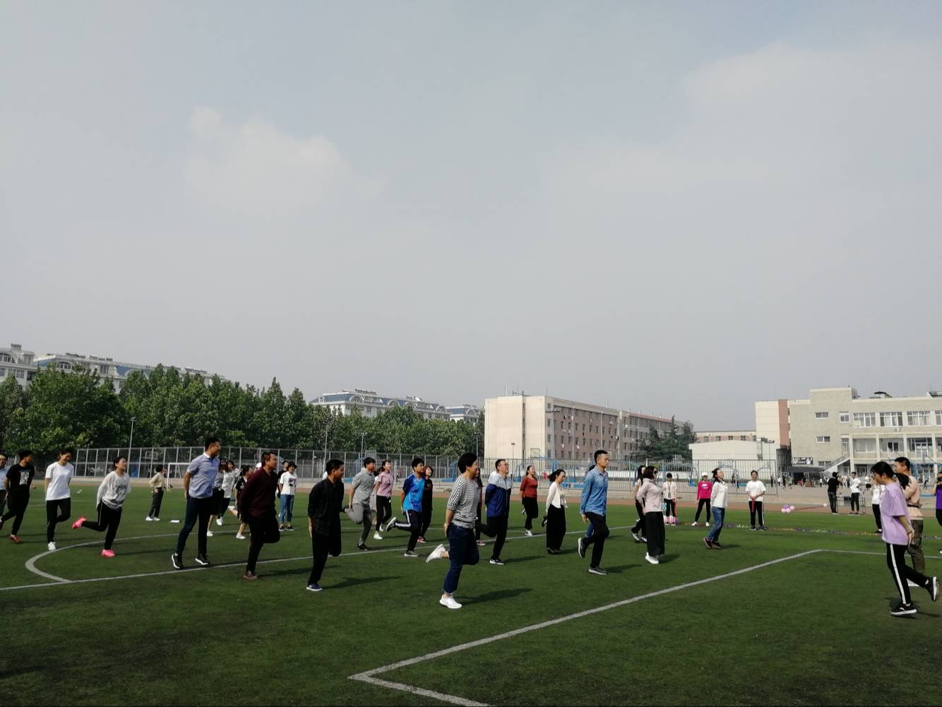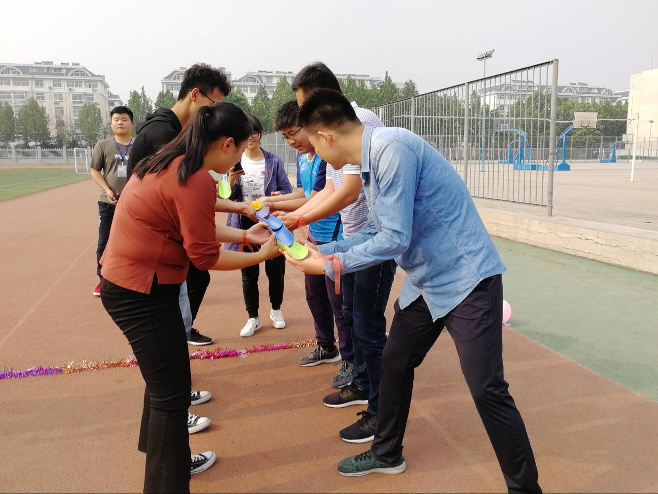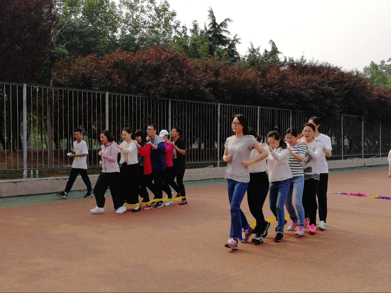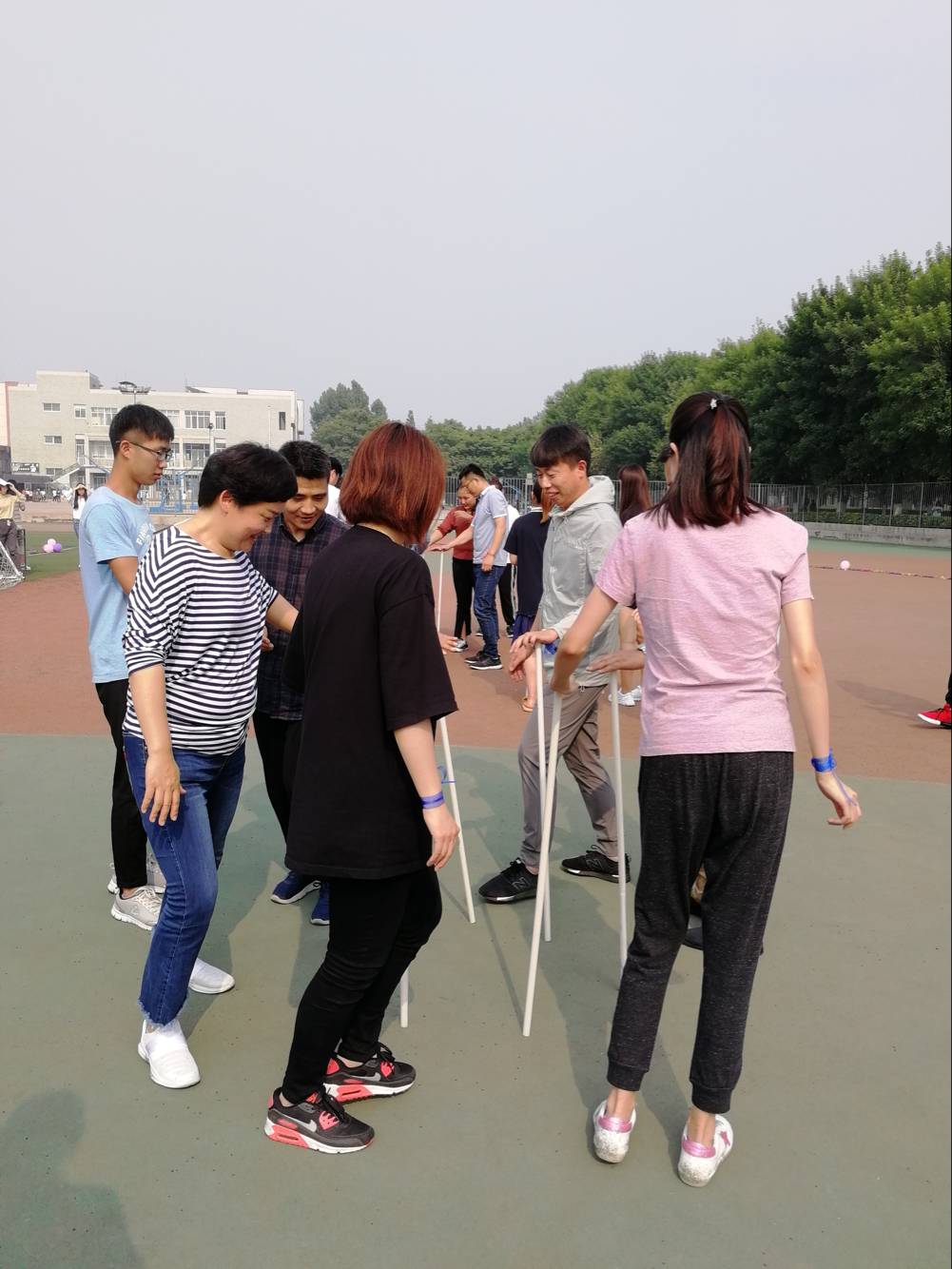团体辅导项目分为热身项目和团体辅导项目,热身项目包括轻柔舒缓体操和“一块五”游戏。老师们跟随舒缓的音乐做出轻柔的体操动作,舒缓筋骨,放松心情。“一块五”游戏迅速点燃了现场氛围,老师们伴着欢快的乐曲绕圈而走,口令一下便迅速“组队联盟”,并有辅导员老师进行精彩才艺展示。团体辅导项目包括“巨人脚步”、“球行万里”、“众星捧月”、“不倒森林”、“穿针引线”五个趣味环节。老师们步调一致,配合协调,争分夺秒,进行着体力与脑力的双重较量。现场氛围十分欢快轻松,操场上笑声不止。老师们传递情谊,培养默契,用合作意识与随机应变的能力展现了团结的力量。