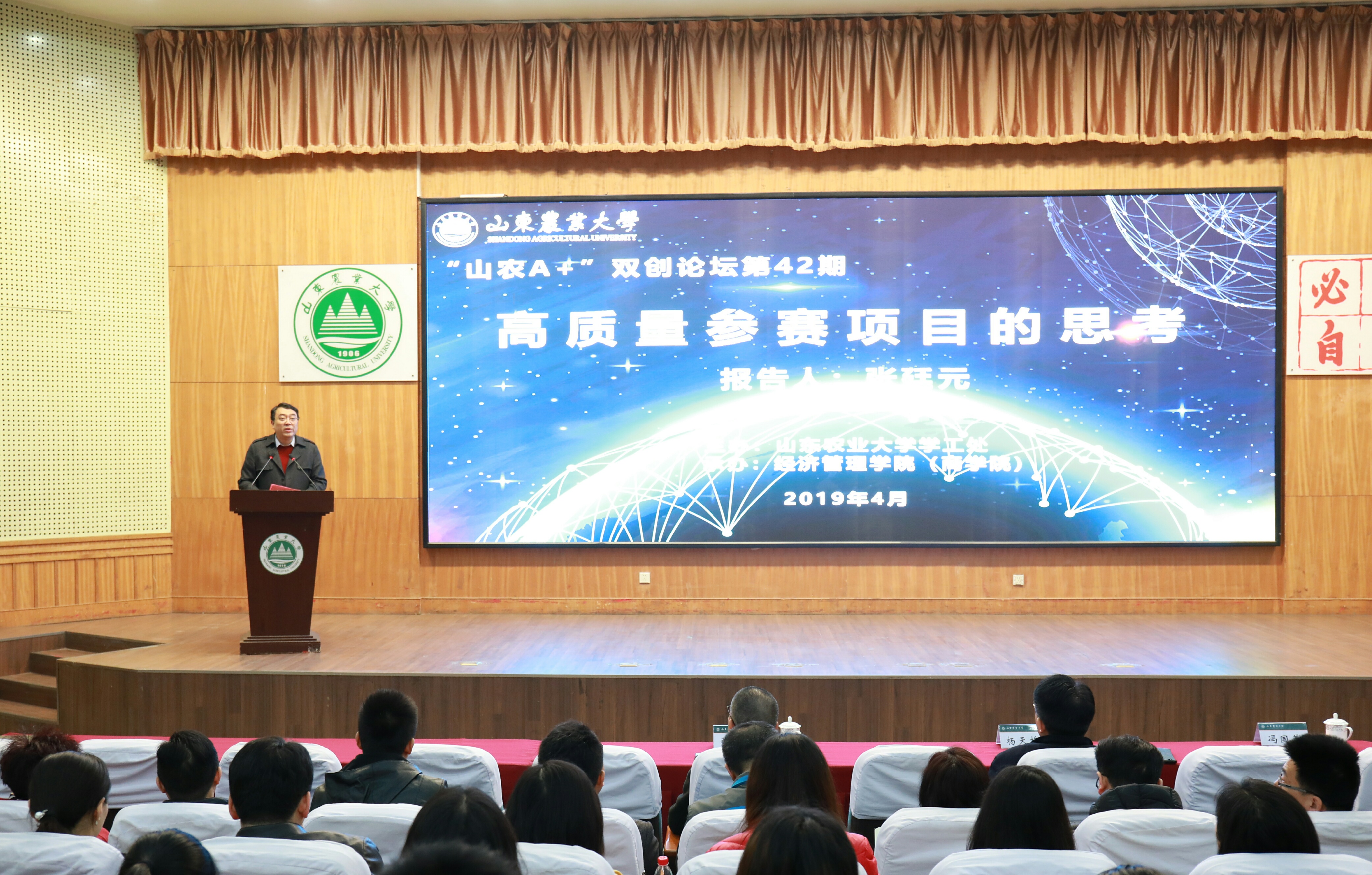 4月12日上午,由新葡的京集团35222vip学工处主办,新葡的京集团35222vip承办的第42期“山农A+”双创论坛在南校区第一学术报告厅举行。成都知度知识产权研究院院长张廷元老师担任主讲,学校党委副书记杨天梅同志、学院党委副书记、创新创业辅导员、第五届“互联网+”大学生创新创业大赛参赛学生和指导教师应邀出席。