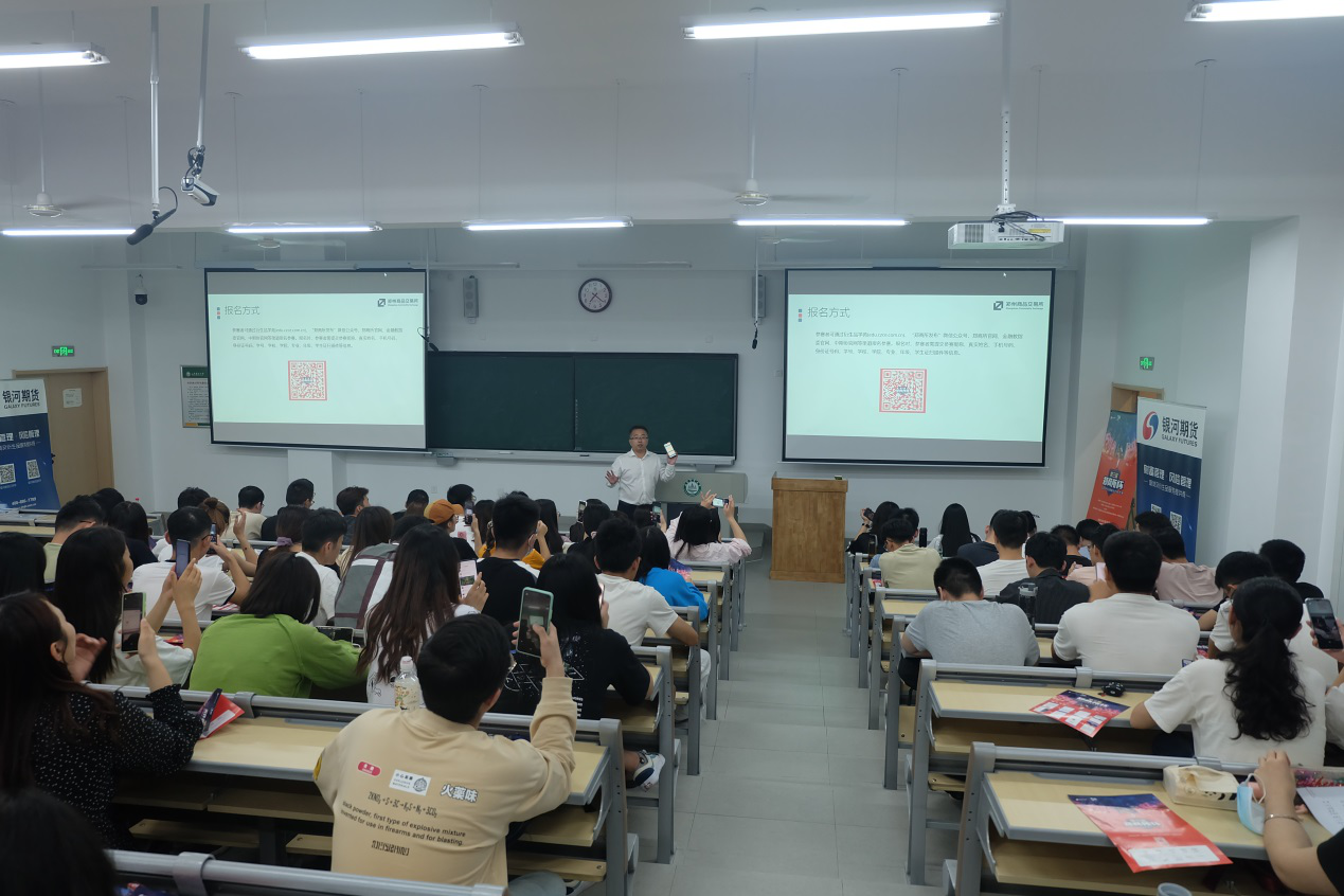 银河期货有限公司青岛营业部研发总监隋晓光、银河期货有限公司青岛营业部高级经理王涌,分别就《“郑商所杯”模拟交易大赛规则宣讲》、《期货市场发展与功能及期货基础知识》、《商品期货投资研究及方法》进行了主题演讲,受到了参会师生的好评。