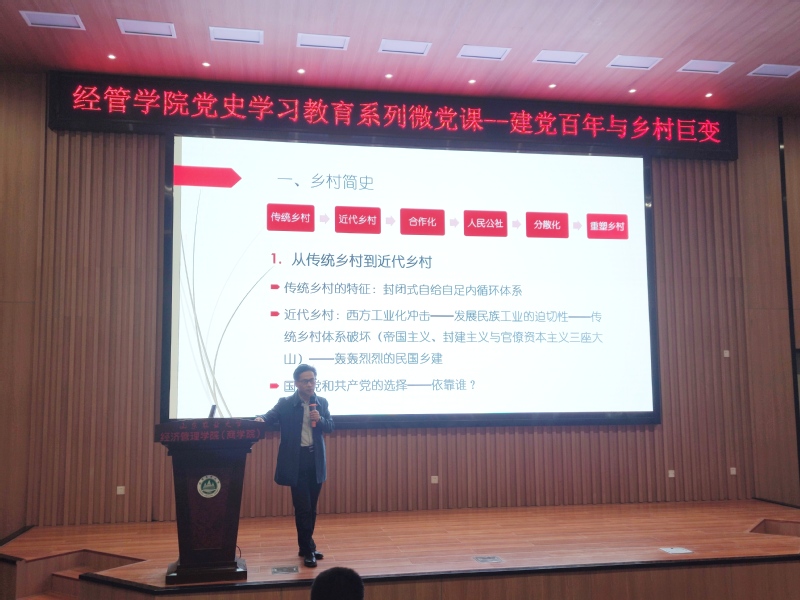 4月14日下午,经管学院党史学习教育系列微党课《建党百年与乡村巨变》正式开课,学院党委书记齐清主持开班仪式,农经系党支部书记徐杰主讲第一期微党课—《从百年党史看百年乡建》,院长陈盛伟全程听课并作总结点评。