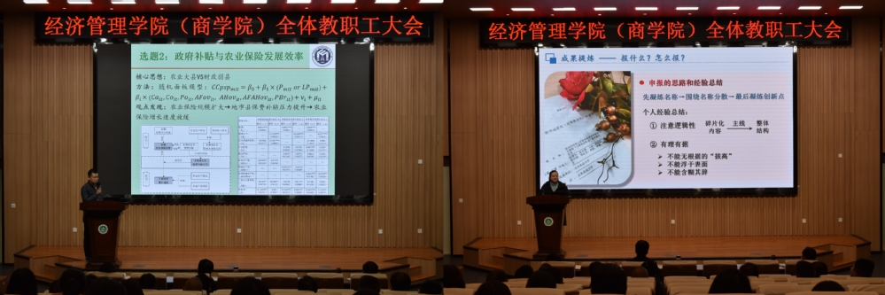 牛浩老师从科研写作方面做了报告,从主持课题情况、发表论文情况、社会服务情况等三个角度介绍了近几年的科研历程,并介绍了农业保险研究方向的基本情况。