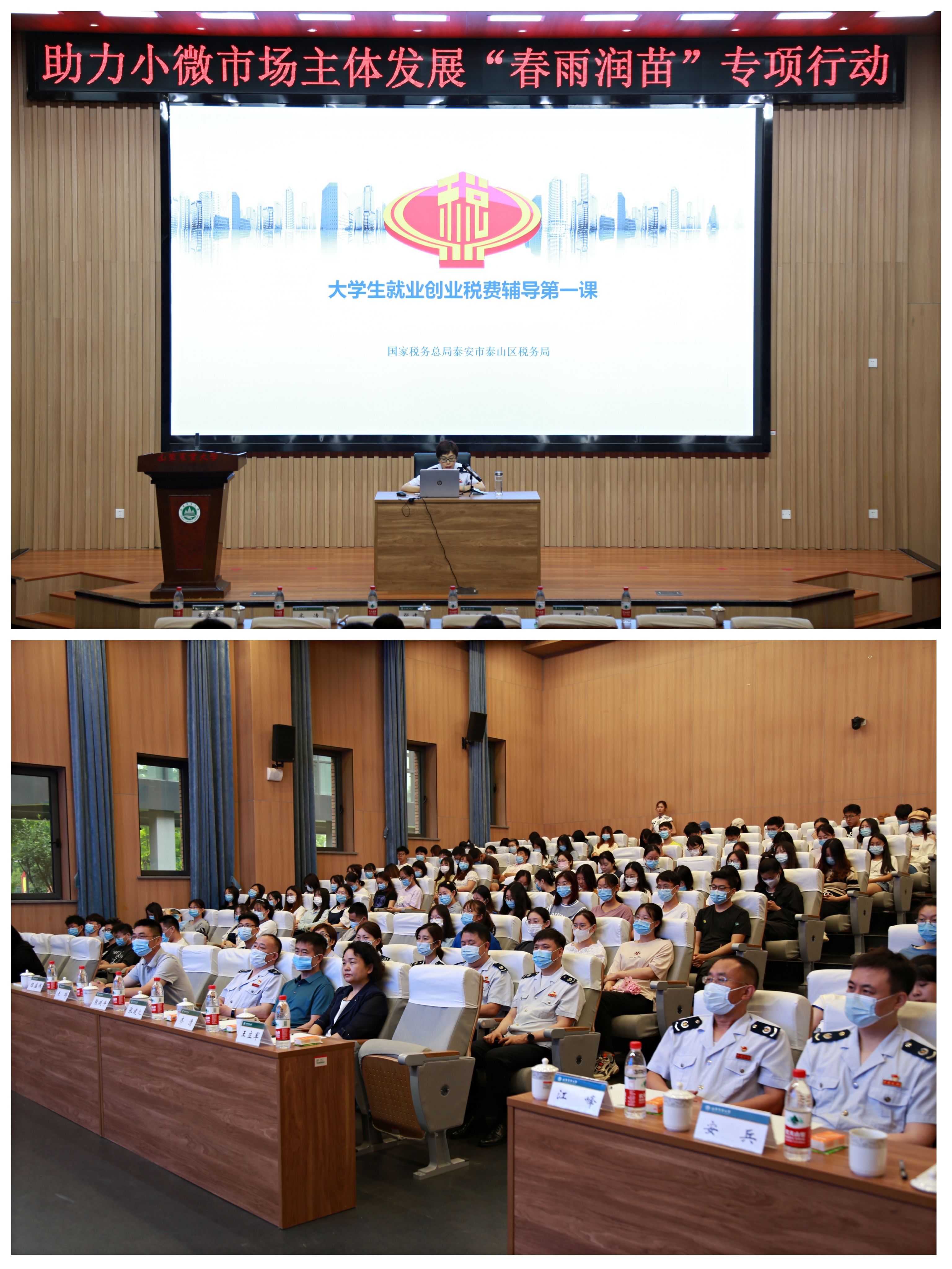 仪式结束后,泰山区税务局青年干部专家张丽萍带来了精彩的授课,向大学生科普了就业创业相关的税费政策,并进行现场交流互动。