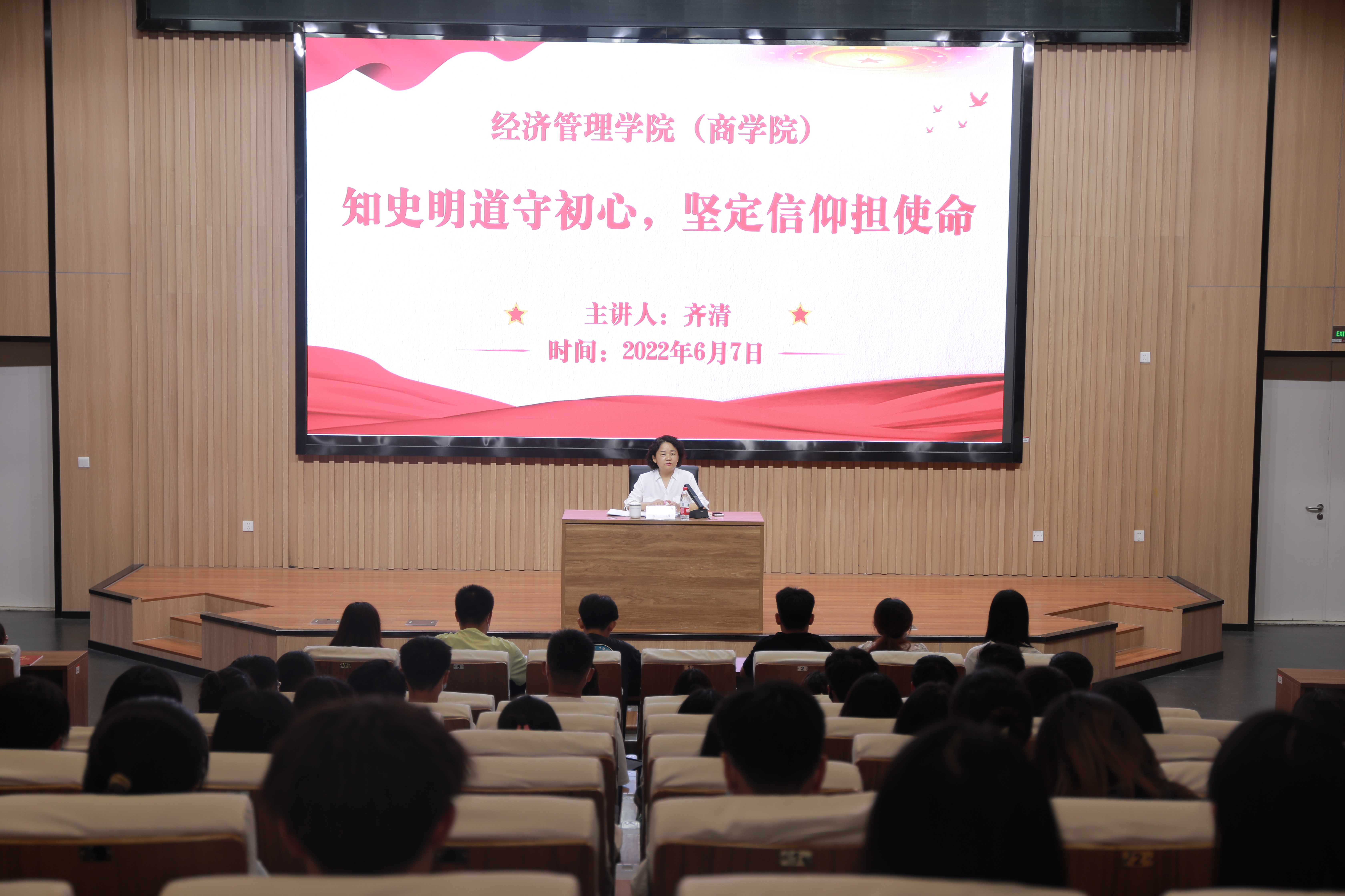 6月7日,经济管理学院(商学院)开展“知史明道守初心,坚定信仰担使命”专题党课,学院党委书记齐清担任主讲,学院新发展的109名学生党员参加此次学习。