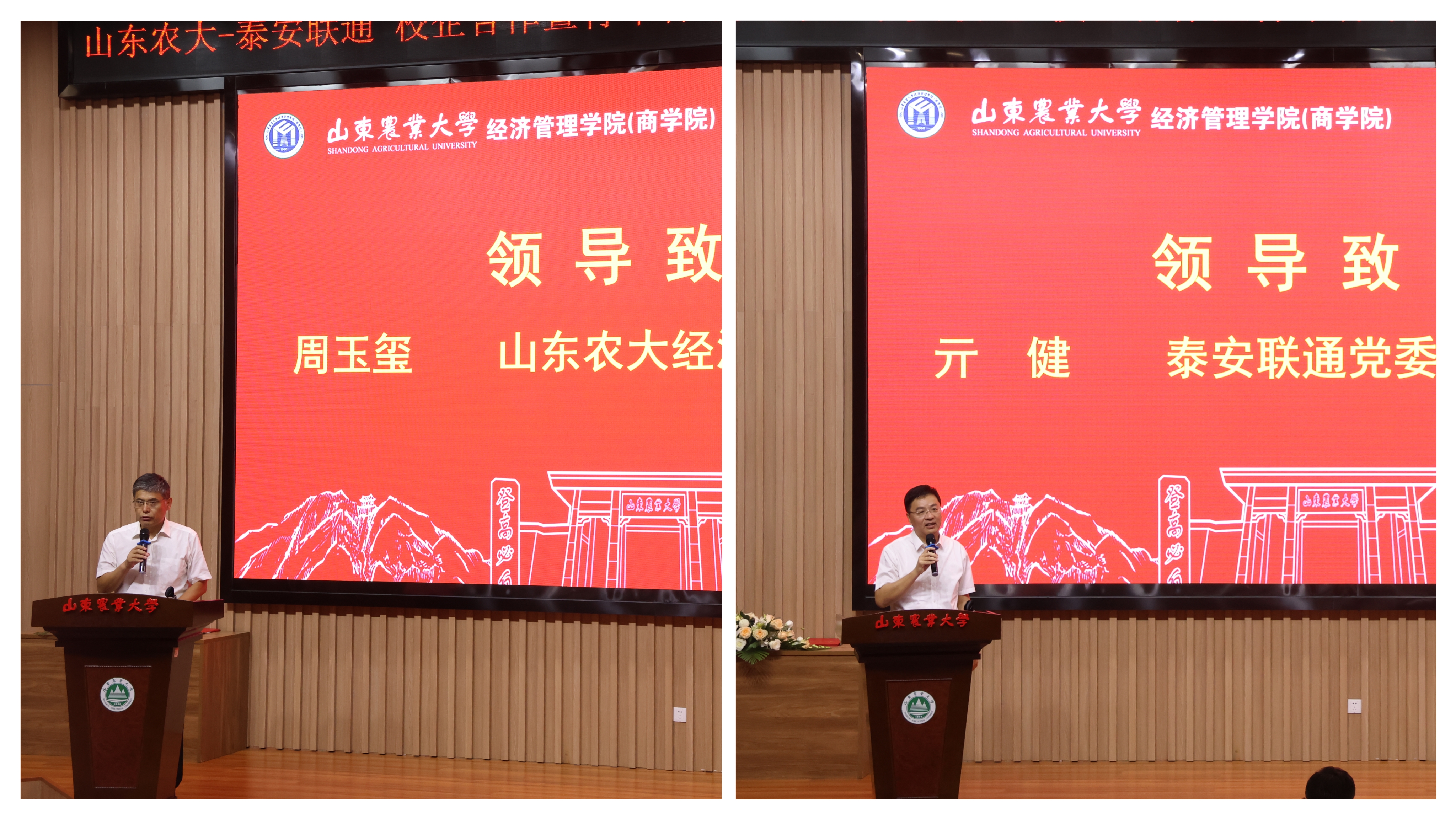 周玉玺院长首先致辞,介绍了学校及学院情况,表示在学校推进一流农业大学建设进程中,经管学院将着眼国家重大战略,充分挖掘发挥学院专业优势,推动学科人才培养和育人质量提升,跟企业家朋友们共同携手,持续推动商科教育创新发展,着力构建以育人、育才为中心的哲学社会科学发展新格局,构建产教融合平台,聚集优势资源,为乡村振兴和产业发展造就产业需要的高素质人才,为提高产业竞争力和汇聚发展新动能提供人才支持和智力支撑。亓健总经理在致辞中首先向学院全体教师致以教师节的祝福,向长期以来支持企业发展的学院领导老师同学们表示感谢。亓总表示随着公司战略转型的不断深入,即熟悉业务技术,又懂管理的复合型人才需求愈发迫切,感谢农大经管学院为本次青年骨干人才管理能力提升项目制定专业的方案和精心安排,并向学院莘莘学子们发出邀请,欢迎同学们到泰安联通实践、实习,表示泰安联通将提供优质的项目实操和锻炼岗位,也希望大家加入联通大家庭。